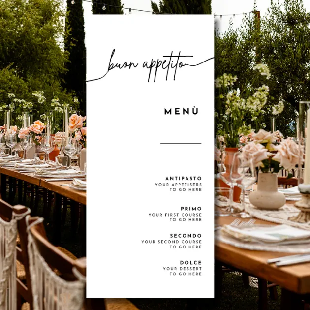Guests love to take pics of their place setting at weddings, so you’re going to need stunning menus! Enter our Wedding Menu template – it’s formatted for Italian courses and totally versatile.